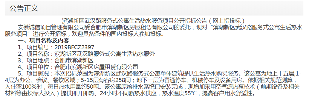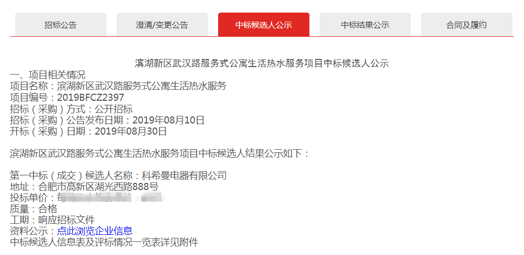 根据安徽合肥公共资源交易中心网站显示,由合肥市滨湖新区房屋租赁有限公司公开招标的滨湖新区武汉路服务式公寓生活热水服务项目经过评估筛选公布中标结果,科希曼均符合项目要求成为唯一中标单位。